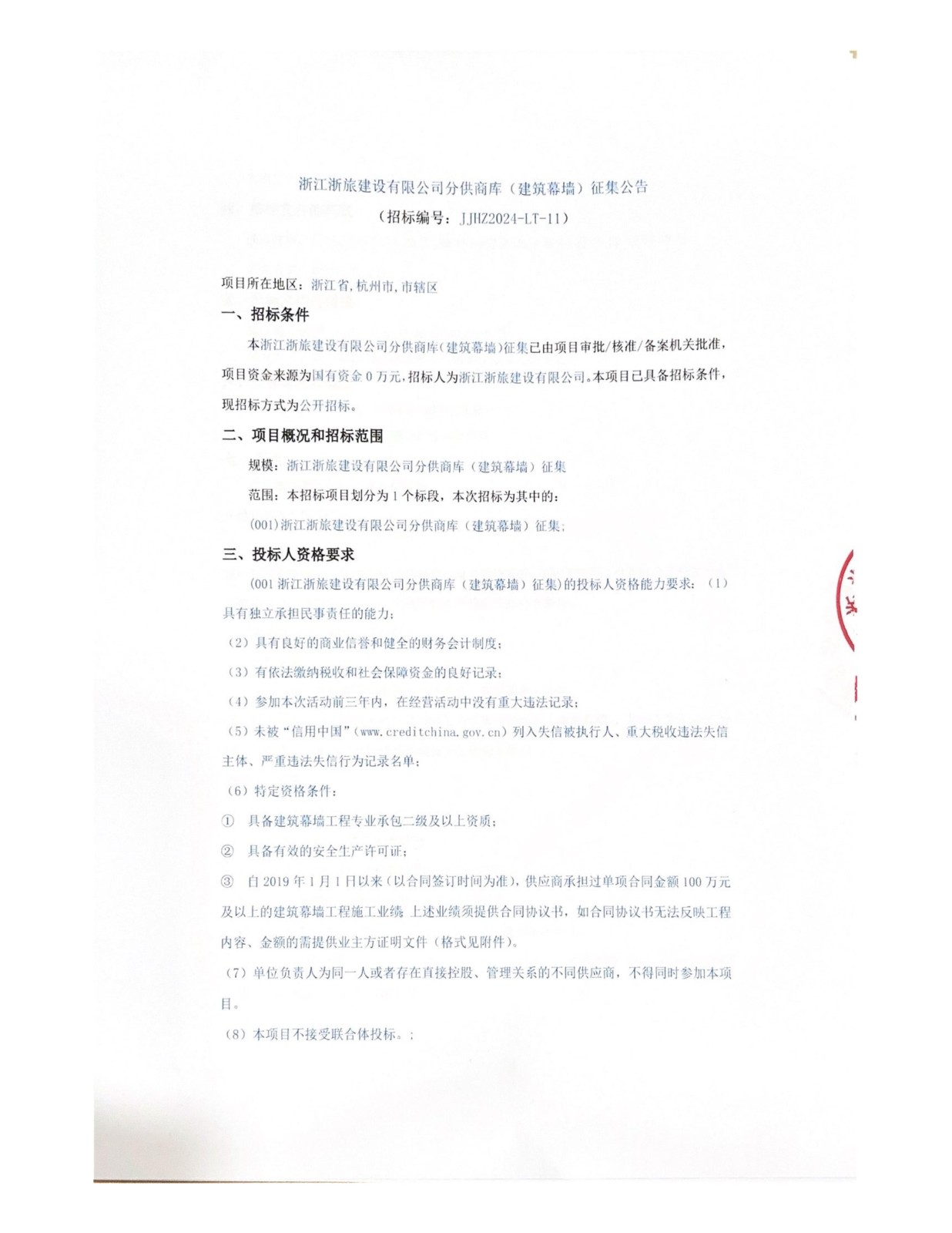 浙江浙旅建设有限公司分供商库(建筑幕墻)征集公告