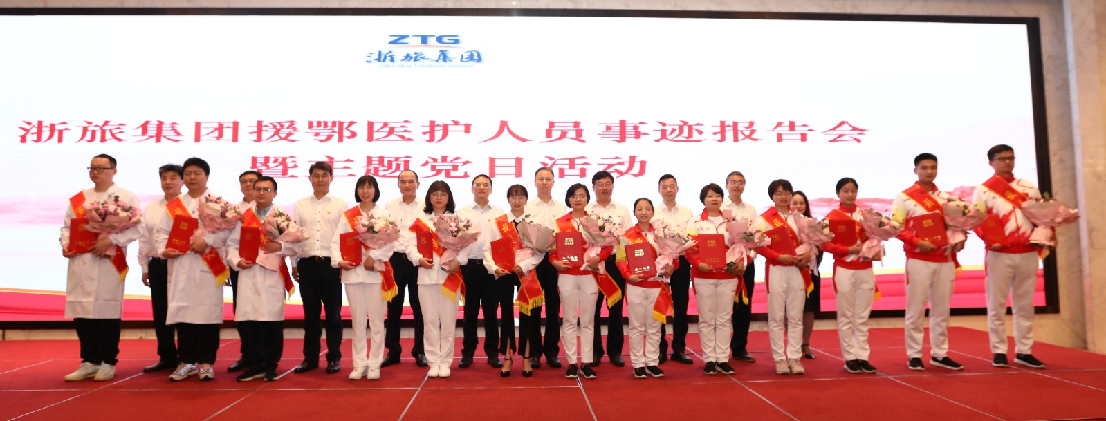 陈祝毅宣读省委常委、组织部部长黄建发对省旅游集团援鄂医护人员的回信和省旅游集团对援鄂医护人员的表彰决定,周国明向高冬梅同志颁发了“浙江省优秀共产党员”证书,省国资委领导、省旅游集团领导班子和监事会成员给13名医护人员“最美浙旅人”颁奖。